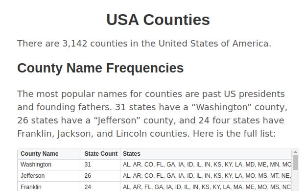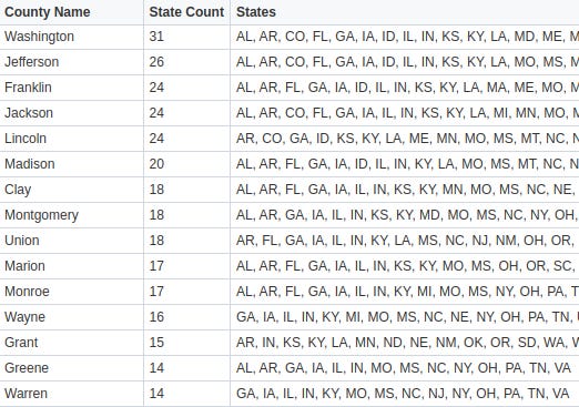 So I began the investigation by first creating a table of the most common county names with their states.